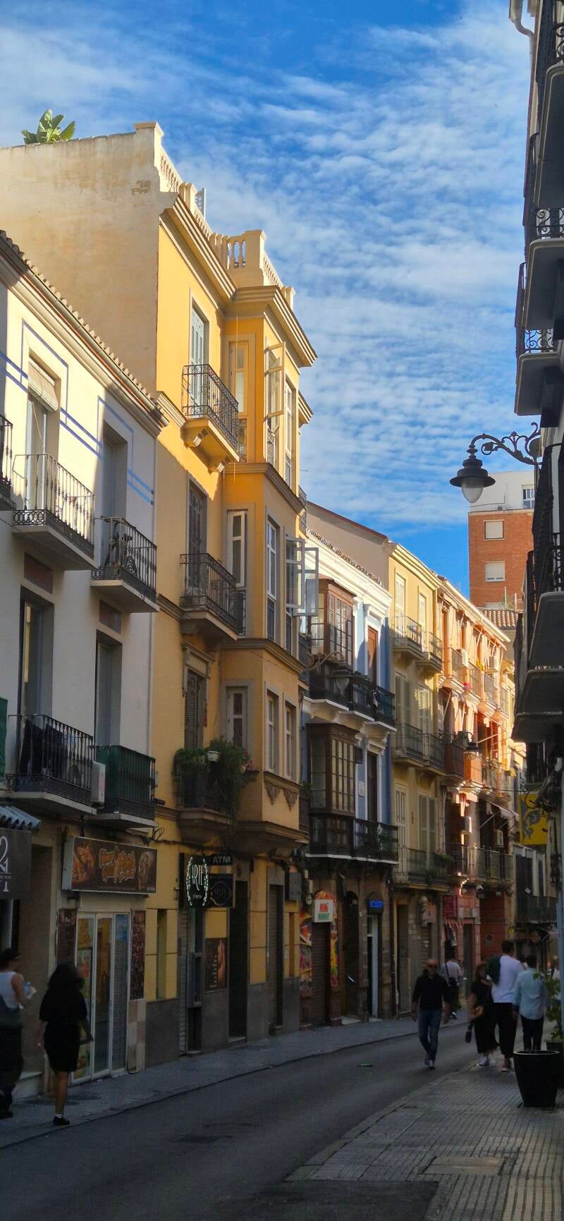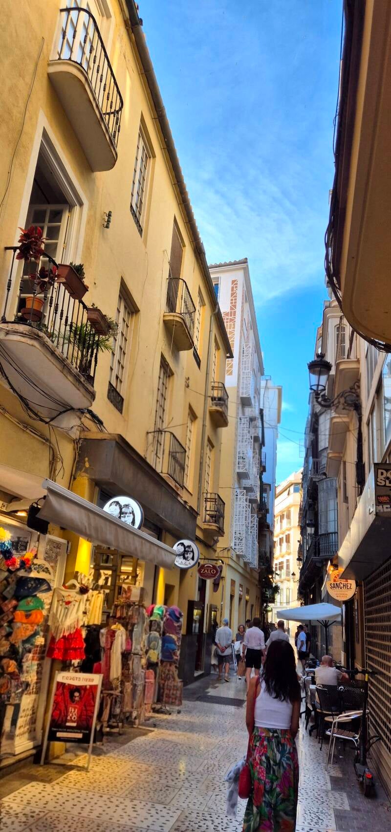 Nous sommes logés dans un appartement dans la Calle Ollerias (spécialisée dans les boutiques vintage très sympa 👍) non loin du centre historique et perpendiculaire à des rues piétonnes très andalouses. Il fait 27 °C et plein soleil🌞. On entend les mouettes, nous respirons l'air 🌬️qui nous a fait défaut à Marrakech.
